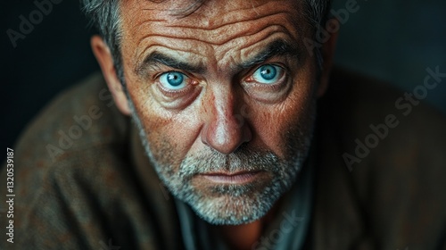 A man in his forties displays lively blue eyes and a striking expression, set against a dark background that highlights his unique features and emotions. The atmosphere is intense and engaging