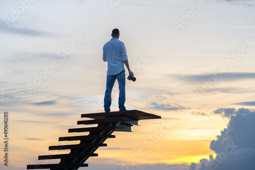 A man in jeans and a white shirt is standing on the stairs against the colorful sky with a camera in his hand