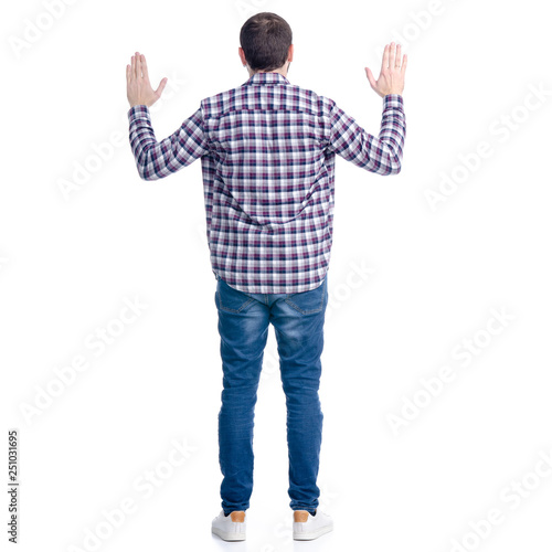 A man in jeans shirt standing hands up on a white background. Isolation, back view