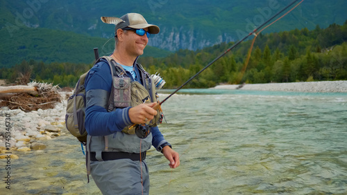A man in outdoor gear, wearing a cap and sunglasses, stands by a river holding a fly-fishing rod. Surrounded by mountains and trees, the clear water and natural setting highlight the tranquility.