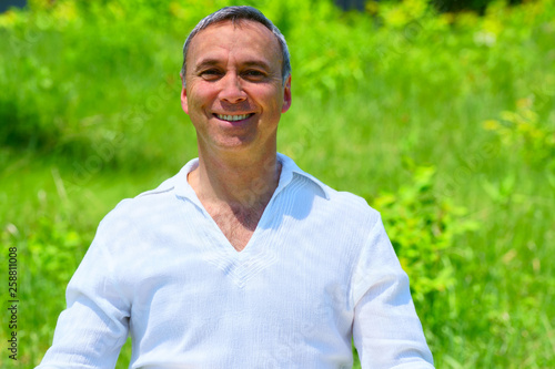 A man in white clothes walking in a field and touching flowers, surrounded by green.