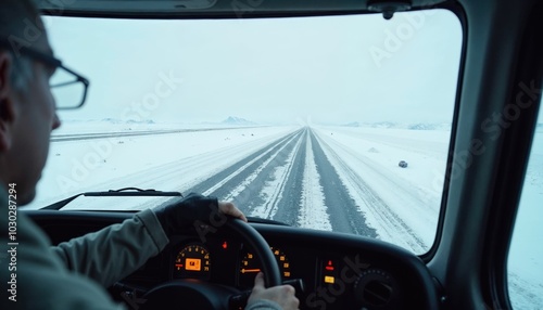 A man is driving a car on a snowy road