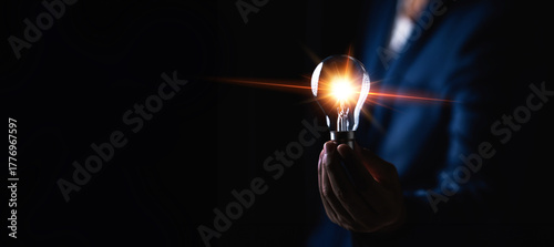 A man is holding a light bulb in his hand. Concept of innovation and creativity, as the light bulb is often associated with new ideas and inventions. The man's attire, a suit