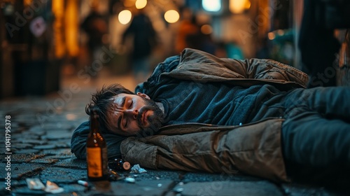A man is laying on the ground with a bottle of beer next to him
