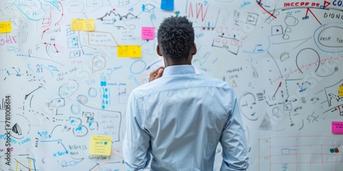 A man is looking at a whiteboard with a lot of writing on it. The writing appears to be a brainstorming session or a meeting. The man seems to be focused on the board
