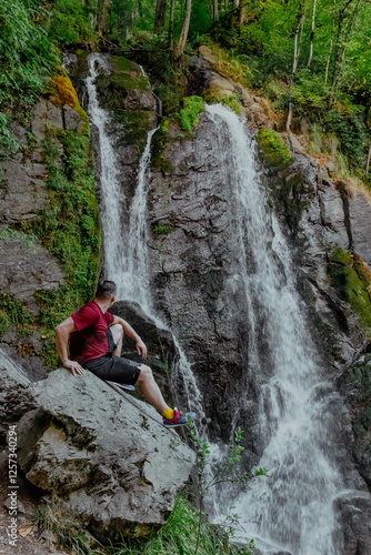 A man is peacefully sitting on a large rock near a beautiful waterfall