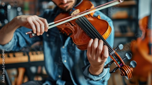 A man is playing a violin in a room with a keyboard