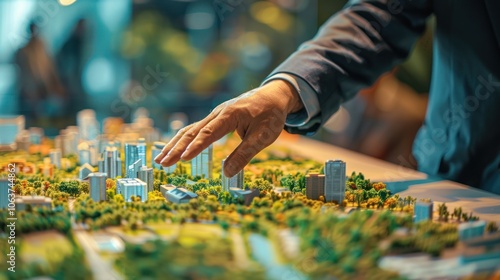A man is pointing at a model of a city
