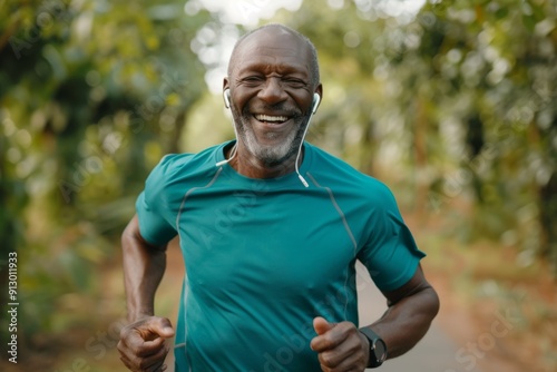 A man is running in a forest while wearing headphones. He is smiling and he is enjoying himself