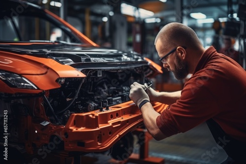 A man is seen working on a car in a factory. This image can be used to depict automobile manufacturing, car maintenance, or industrial work.
