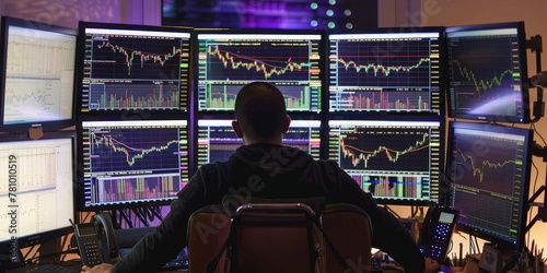 A man is sitting in front of a computer monitor with multiple screens displaying financial data. The man is focused on the screens. Concept of concentration and importance