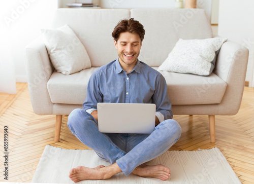 A man is sitting on the floor in a living room, using a laptop. He is smiling and appears to be relaxed.