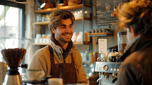A man is smiling at a woman behind the counter of a coffee shop. The coffee shop is filled with various items such as cups, bottles, and a bowl