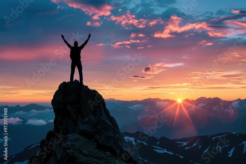 A man is standing on a mountain peak, with the sun setting in the background, generative ai image