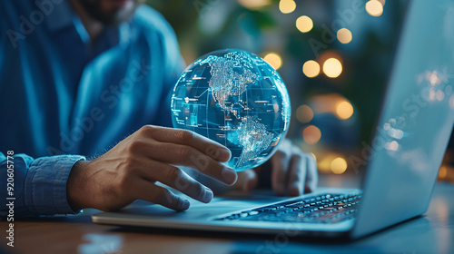 A man is using a laptop to draw a globe. The globe is surrounded by a blue sphere and is glowing. Concept of creativity and innovation, as the man is using technology to create a unique.