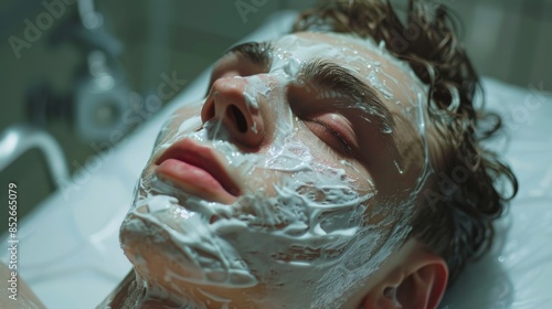 A man lies waiting for cosmetic surgery, his face covered in white cream, beauty concept