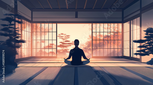 A man meditates in a serene room, surrounded by traditional japanese shoji screens, finding peace and mindfulness. Tranquil Zen Garden. Illustration
