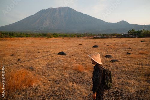 A man of European appearance, in a traditional Asian hat, travels around the island with a backpack and admires the view of Mount Agung volcano.