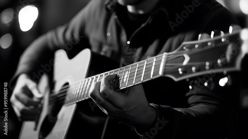 A man playing guitar in a cozy living room, music sheets scattered around, a sense of passion and creativity