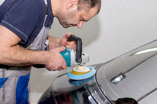 A man polishes a black car with a polisher