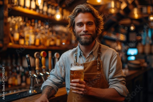 A man savors the crisp taste of his beer, his human face lit up with contentment as he stands among the lively atmosphere of a bustling pub, his stylish clothing reflecting the indoor lighting, while