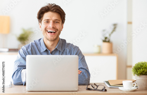 A man sits at his desk with a laptop, smiling brightly and looking at the camera.