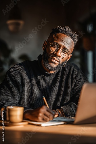 A man sits in a cafe in front of a laptop and a sheet of paper on which he writes something