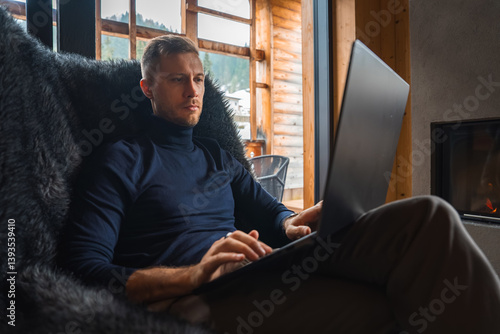 A man sits on a fur covered chair in a wooden paneled room with a modern fireplace. A large window reveals a mountainous landscape in the Italian Alps.