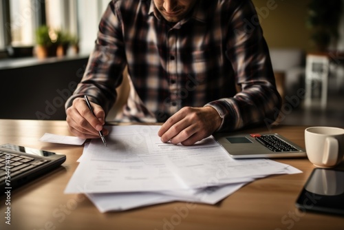 A man sitting at a table with papers and a laptop. Suitable for business and office concepts