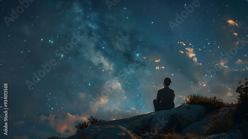 A man sitting on a hill and gazing at the beautiful stars in the sky at night.