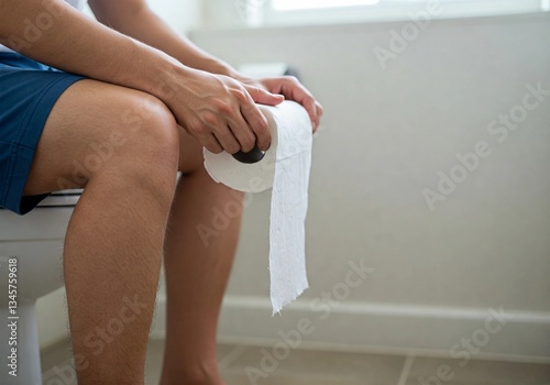 A man sitting on a toilet holding a roll of toilet paper in a modern bathroom. The image represents hygiene, daily routine, digestive health, constipation, diarrhea, and personal care concepts.