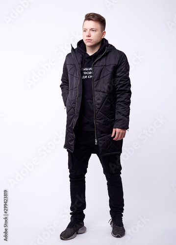 A man stand up wearing black jacket isolated white at the studio.
