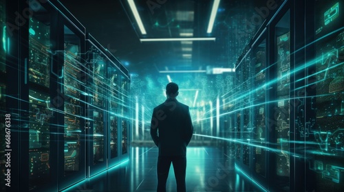 a man standing in a dark room with lots of lights