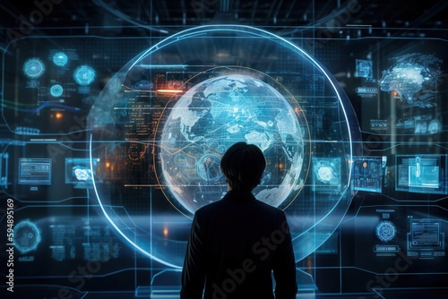A Man Standing In Front Of A Futuristic Display Of Technology And Information Deep Sea Trench Stereoscopic Photography Data Analytics Generative AI