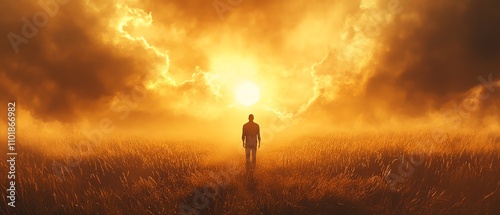 A man standing tall in the middle of a field, gazing at the sun, with a powerful connection to faith and nature, surrounded by golden light and open space