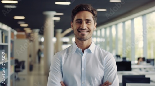 A man standing with crossed arms in an office. Suitable for business concepts