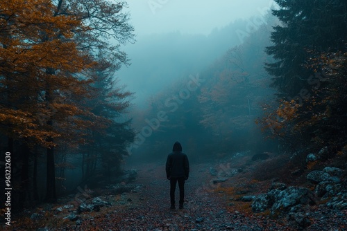 A man stands alone in a forest, surrounded by trees and leaves