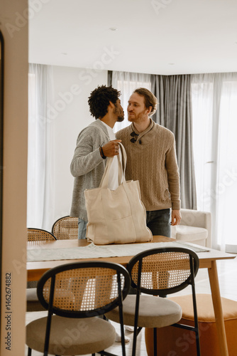 A man stands and holds a bag on a table while a man stands next to him, they look at each other