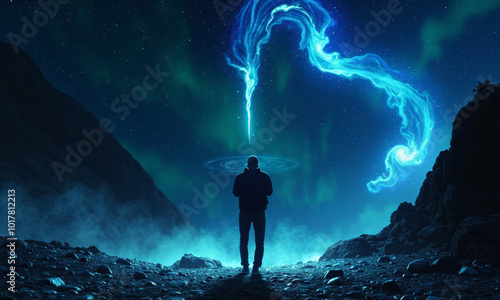 a man stands in a mountain with the aurora borealis above him.
