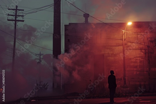 A man stands in front of a building with smoke coming out of it