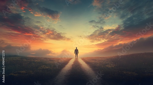 A man stands on a dirt path, facing a vibrant sunset with colorful clouds in the sky, creating a serene and reflective atmosphere.