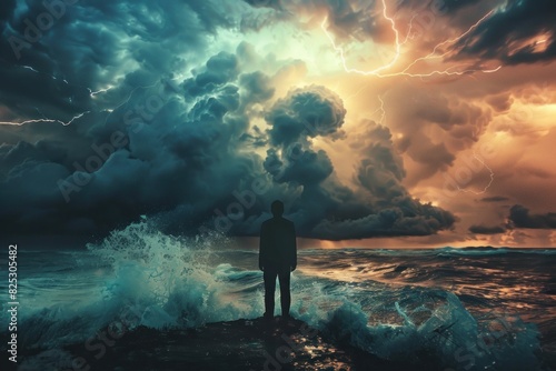A man stands on a rocky shoreline in the middle of a stormy sea