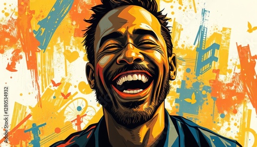 A man stands with a broad smile, radiating happiness against a backdrop of colorful urban art. His laughter brings warmth to the lively city scene illuminated by the soft glow of sunset
