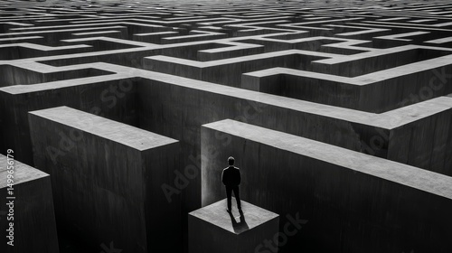 A man staring at a massive and complex labyrinth, an intricate maze symbolizing challenge, decision making, and exploration, with detailed patterns and deep pathways representing problem solving.