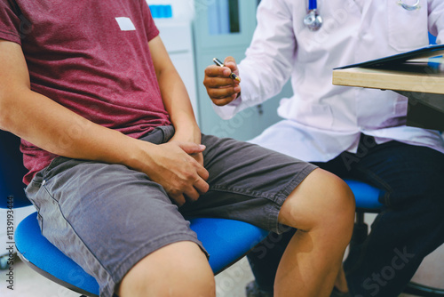 A man suffering from urinary tract infections visits a doctor at the examination table in a hospital.symptoms, discusses benign prostatic hyperplasia (BPH), and provides advice and treatment