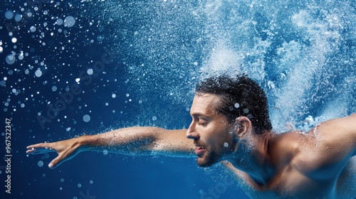 A man swims beneath the water's surface, creating dynamic bubbles around him as sunlight filters through. His focused expression captures the essence of the moment, emphasizing his fluid motion