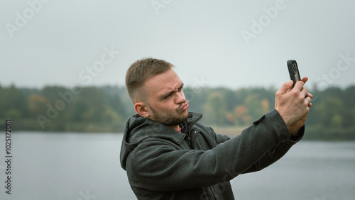 A Man Taking a Selfie by the Water on a Cloudy Day, Showcasing Nature and Modern Technology in a Serene Outdoor Setting