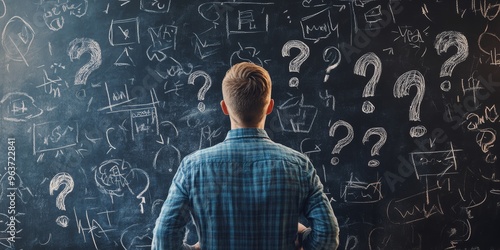 A man thoughtfully stands before a chalkboard filled with question marks and scribbles, contemplating his business plan and various strategies for achieving success in his entrepreneurial journey