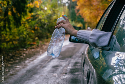A man throws an empty plastic bottle out of a car. We must protect the environment