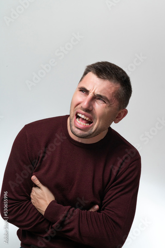 A man touches his stomach with two hands, on a white background with copy space, Stomach pain in a man.